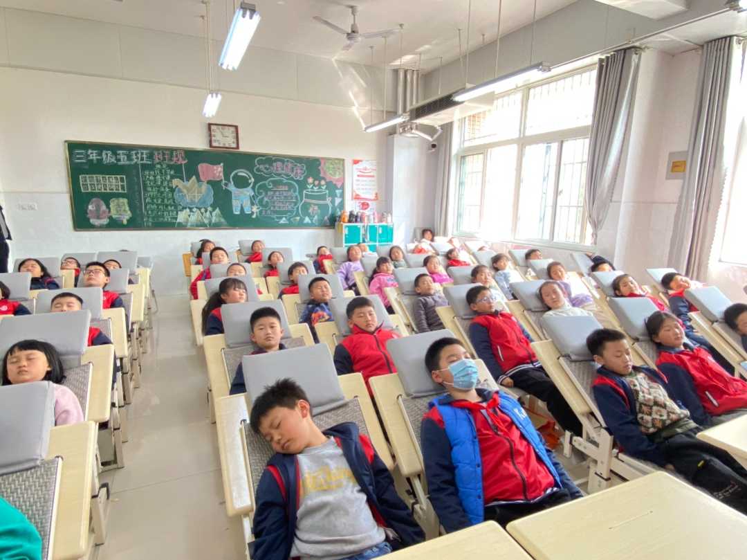 “趴著睡”轉(zhuǎn)變到“躺平睡”,為學(xué)生提供一個安心、舒適的午休場所,下午的課堂質(zhì)量有了明顯地提升,孩子的健康成長也得到了保障。每到午睡時間,孩子們熟練地將桌椅調(diào)整到午睡狀態(tài),不到一分鐘,教室秒變午睡室。
