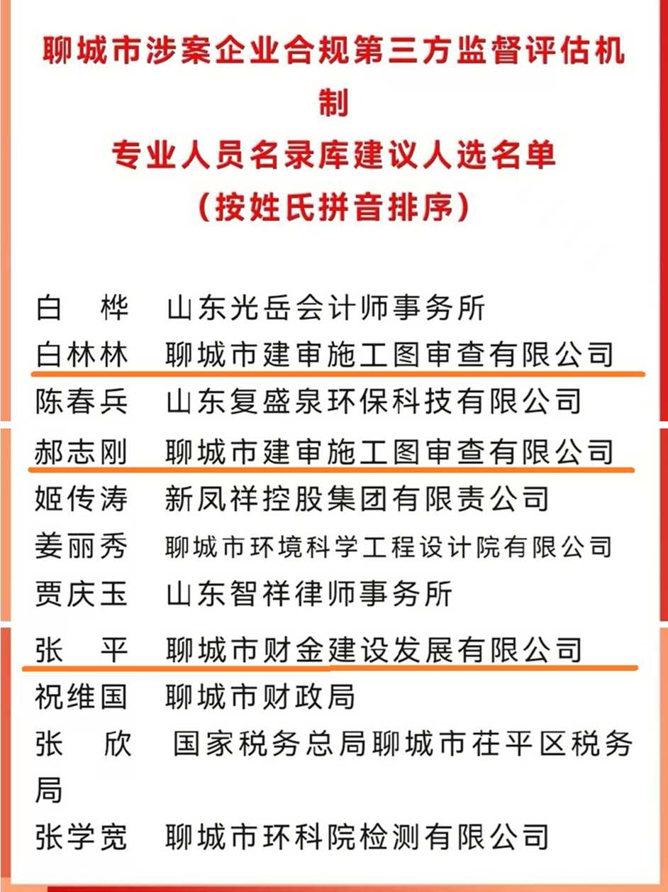 近日,聊城市涉案企業(yè)合規(guī)第三方機制管委會公示聊城市涉案企業(yè)合規(guī)第三方監(jiān)督評估機制專業(yè)人員名錄庫人員名單,我集團審計法務(wù)部張平、圖審公司郝志剛、白林林三位同志經(jīng)公開公告、個人報名、組織推薦、管委會研究、擬入庫公示等程序,確定為聊城市涉案企業(yè)合規(guī)第三方監(jiān)督評估機制專業(yè)人員。